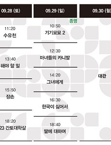 Now Playing3100 06.19-06.25 상영시간표 2025. 6. 13. <레슨> 상영일정·인디토크 / 영화예매 _7월 27일 종영 상영일정 7월 18일(금) 13:007월 23일(수) 19:007월 27일(일) 11:00 종영 일시: 6월 29일(일) 오후 1시참석: 김경래 감독 | 정승민, 이유하 배우진행: 김병규 평론가 * 참석자는 변경될 수 있습니다. * 행사 당일 온라인 예매 환불이 불가합니다. INFORMATION - 제목: 레슨 - 감독: 김경래 - 주연: 정승민, 이유하, 전한나 - 제작: 한국예술종합학교 - 배급: (주)모토 - 러닝타임: 94분 - 장르: 멜로, 드라마 - 관람등급: 15세이상관람가- 개봉: 2025년 6월 25일 SYNOPSIS “우리는 지금... 무슨 사이예요?” 영어 과외 강사 ‘경민’은 3년째 연인 ‘선희’와 안정적인 연애 중이다. 큰 문제 없이 흘러가던 일상. 하지만 선희의 결혼 압.. 2025. 6. 12. <바다호랑이> 상영일정·인디토크 / 영화예매 상영일정 8월 22일(금) 11:00 일시: 7월 8일(화) 오후 7시참석: 윤순환 굿프로덕션 대표 * 참석자는 변경될 수 있습니다. * 행사 당일 온라인 예매 환불이 불가합니다. INFORMATION 제 목 | 바다호랑이(Sea Tiger) 감 독 | 정윤철 출 연 | 이지훈, 손성호, 박호산 외 장 르 | 감동실화 드라마 상영 시간 | 105분 관람 등급 | 15세이상관람가 제공/제작 | 영화사 침, 굿프로덕션 배 급 | 영화로운형제 개 봉 | 2025년 6월 25일 SYNOPSIS “아이들아 가자, 엄마한테 데려다 줄게” 나는 매일, 세상에서 가장 슬픈 포옹을 합니다… 2014년 봄, 침몰한 세월호 참사 현장에서 목숨을 걸고 희생자들을 가족 품으로 데려.. 2025. 6. 12. [07.09] 봄밤 | 강미자 INFORMATION 제 목 | 봄밤 영 제 | Spring Night 연 출 | 강미자 출 연 | 한예리, 김설진 장 르 | 드라마 제 작 | 월원 영화사 배 급 | 시네마 달 개 봉 | 2025년 7월 9일 러 닝 타 임 | 67분 등 급 | 15세 이상 관람가 상 영 내 역제75회 베를린국제영화제 – 포럼 제11회 스페인필마드리드국제영화제 – 경쟁 제29회 부산국제영화제 – 한국영화의오늘: 비전 제50회 서울독립영화제 – 본선 장편경쟁 제1회 서울작심영화제 제13회 무주산골영화제 – '창' 경쟁 제21회 인천여성영화제 SYNOPSIS 국어교사였던 ‘영경’과 철공소를.. 2025. 6. 12. [06.25] 레슨 | 김경래 INFORMATION - 제목: 레슨 - 감독: 김경래 - 주연: 정승민, 이유하, 전한나 - 제작: 한국예술종합학교 - 배급: (주)모토 - 러닝타임: 94분 - 장르: 멜로, 드라마 - 관람등급: 15세이상관람가- 개봉: 2025년 6월 25일 SYNOPSIS “우리는 지금... 무슨 사이예요?” 영어 과외 강사 ‘경민’은 3년째 연인 ‘선희’와 안정적인 연애 중이다. 큰 문제 없이 흘러가던 일상. 하지만 선희의 결혼 압박이 점점 경민을 조이기 시작한다. 결혼식에 함께 참석해 달라는 작은 부탁조차 무겁게 느껴진 어느 날, 두 사람의 관계엔 처음으로 깊은 균열이 생긴다. 그 무렵, 과외 학생의 소개로 ‘영원’을 만나게 된 경민. 피아노를 가르치는 영원은 “자막 없이 영화를 보고 싶다”며 영어 .. 2025. 6. 12. [06.25] 바다호랑이 | 정윤철 INFORMATION 제 목 | 바다호랑이(Sea Tiger) 감 독 | 정윤철 출 연 | 이지훈, 손성호, 박호산 외 장 르 | 감동실화 드라마 상영 시간 | 105분 관람 등급 | 15세이상관람가 제공/제작 | 영화사 침, 굿프로덕션 배 급 | 영화로운형제 개 봉 | 2025년 6월 25일 SYNOPSIS “아이들아 가자, 엄마한테 데려다 줄게” 나는 매일, 세상에서 가장 슬픈 포옹을 합니다… 2014년 봄, 침몰한 세월호 참사 현장에서 목숨을 걸고 희생자들을 가족 품으로 데려온 민간 잠수사 나경수는 고통스러운 잠수병과 정신적 트라우마에 시달린다. 또 해경이 민간 잠수사 대표 류창대를 참사 현장에서 사고로 죽은 동료 잠수사에 대한 과실치사죄로 넘기며 재판.. 2025. 6. 12. [06.25] 애니살롱전 | Home Sweet Home 인디스페이스 X 서울인디애니페스트 애니살롱전 6월: Home Sweet Home일시: 2025년 6월 25일(수) 오후 7시상영작: 참석: 강태이 감독, 김혜미 감독, 김봄 감독, 김창수 감독, 이문주 감독진행: 최유진 서울인디애니페스트 집행위원장 * 참석자는 변경될 수 있습니다.* 행사 당일 온라인 예매 환불이 불가합니다. 2024 | 강태이 | 애니메이션(Cell, Drawing) | 5분누워있는 노인에게 자장가를 불러주는 자식, 노인이 잠에 든 걸 확인한 후 방을 나간다. 잠에서 깬 노인의 눈앞에 방은 물로 가득 차 있고, 나비가 노인의 주변을 맴돌며 기다리고 있다. 2024 | 이희영 | 애니메이션(Puppet) | 5분오랜 시간 함께 살아온 고양이 '하루'를 떠나보내고 고양.. 2025. 6. 9. 06.12-06.18 상영시간표 2025. 6. 5. <풀> 상영일정·인디토크 / 영화예매 _7월 22일 종영 상영일정 7월 14일(월) 14:507월 22일(화) 17:10 종영 일시: 6월 30일(월) 오후 7시참석: 이수정 감독진행: 김미영 감독 ( 연출) * 참석자는 변경될 수 있습니다. * 행사 당일 온라인 예매 환불이 불가합니다. INFORMATION 제목: 풀 (영문제목: Pull) 감독: 이수정 러닝타임: 89분 제작: 생의 한가운데 배급: 미디어나무(주), 생의 한가운데 등급: 청소년관람불가 출연: 권용현, 천호균, 이명현, 강병석, 빌스택스, 보리, 김도, 제이제이 외 SYNOPSIS 일년생 풀 대마초가 마약으로 취급되며 여전히 금기시되고 있는 한국에서 풀과 접속한 사람들의 이야기. 아픈 사람에게 대마초를 준 죄로 감옥에 갔다 오는 권
