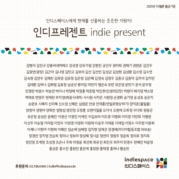 - 새로운 이야기를 만나실 수 있도록 인디스페이스 초대권, 극장기록집 '인디즈'와 뉴스레터를 정기적으로 보내드립니다.