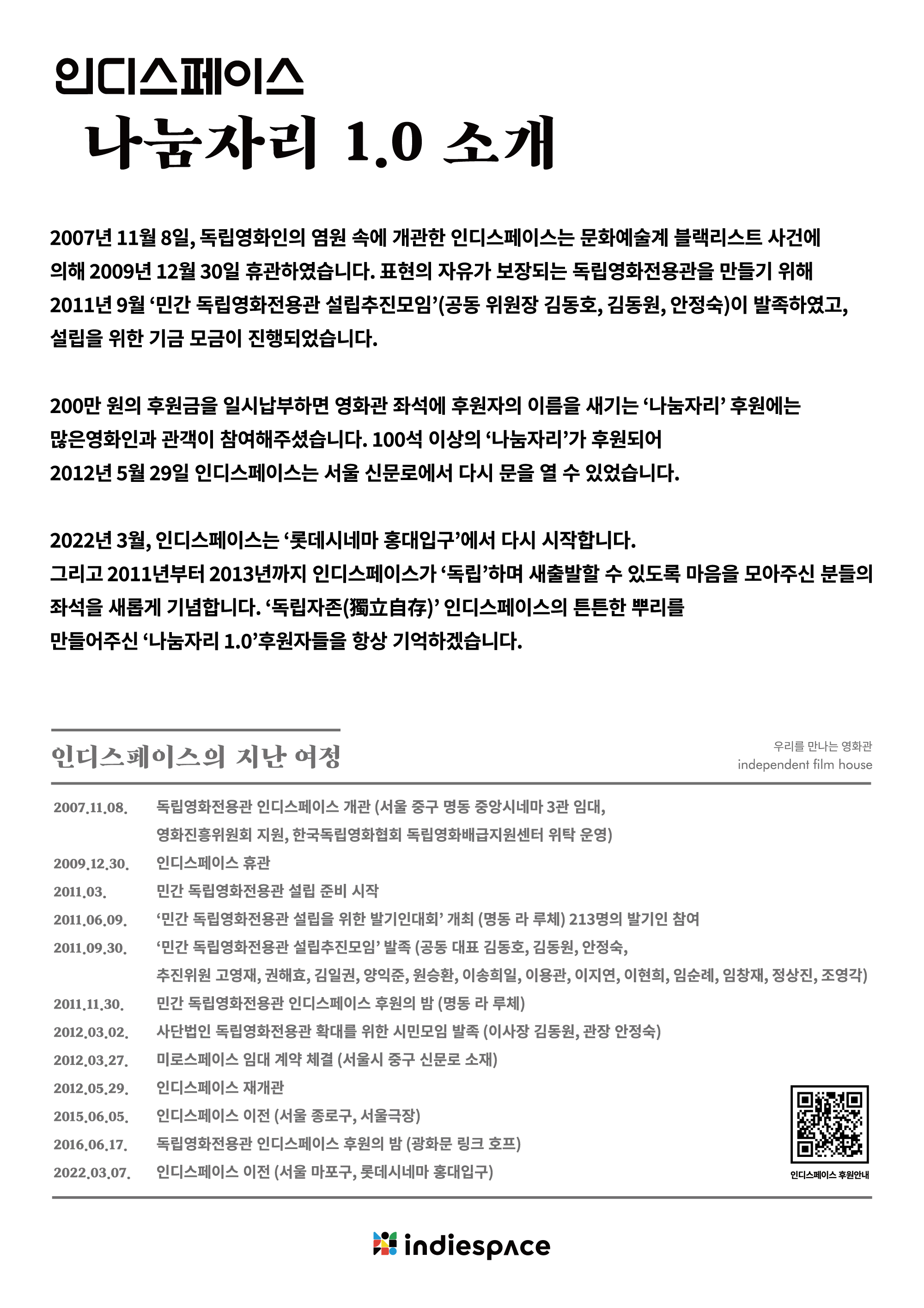 * 나눔자리 후원 신청서 다운로드 후 작성하여 indie@indiespace.kr 로 보내주세요.